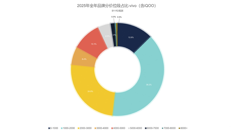 依据RD观测的,2025年全年品牌价位段占比数据,所显示的情况来看,OPPO和vivo确实极其相像,两大品牌的产品价位段市场份额,呈现出高度趋同的特性。