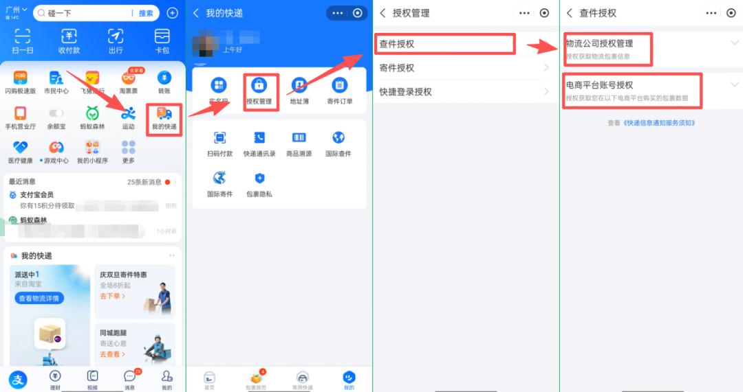 当进入“我的快递”这个应用程序之后,找到并点击“授权管理”选项,接着在“授权管理”的下拉菜单里点击“查件授权”,然后把自己心中所想想要查询的手机号码去进行授权操作。之后,在下面所呈现的“电商平台账号授权”界面当中,将淘宝、阿里1688以及闲鱼这三个不同电商平台账号全部选中,而后再退回至回到“我的快递”,此时就能够成功查看自己的快递相关信息了。