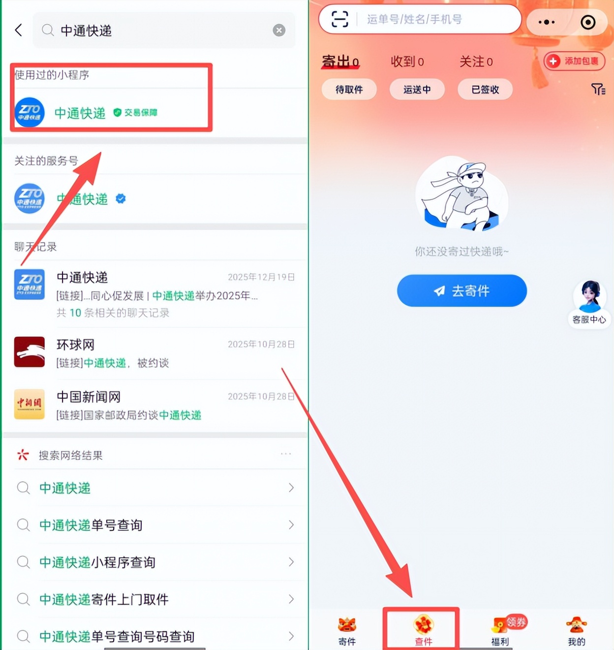 3、关注各自公众号或者小程序(下面以“中通快递”为例)
